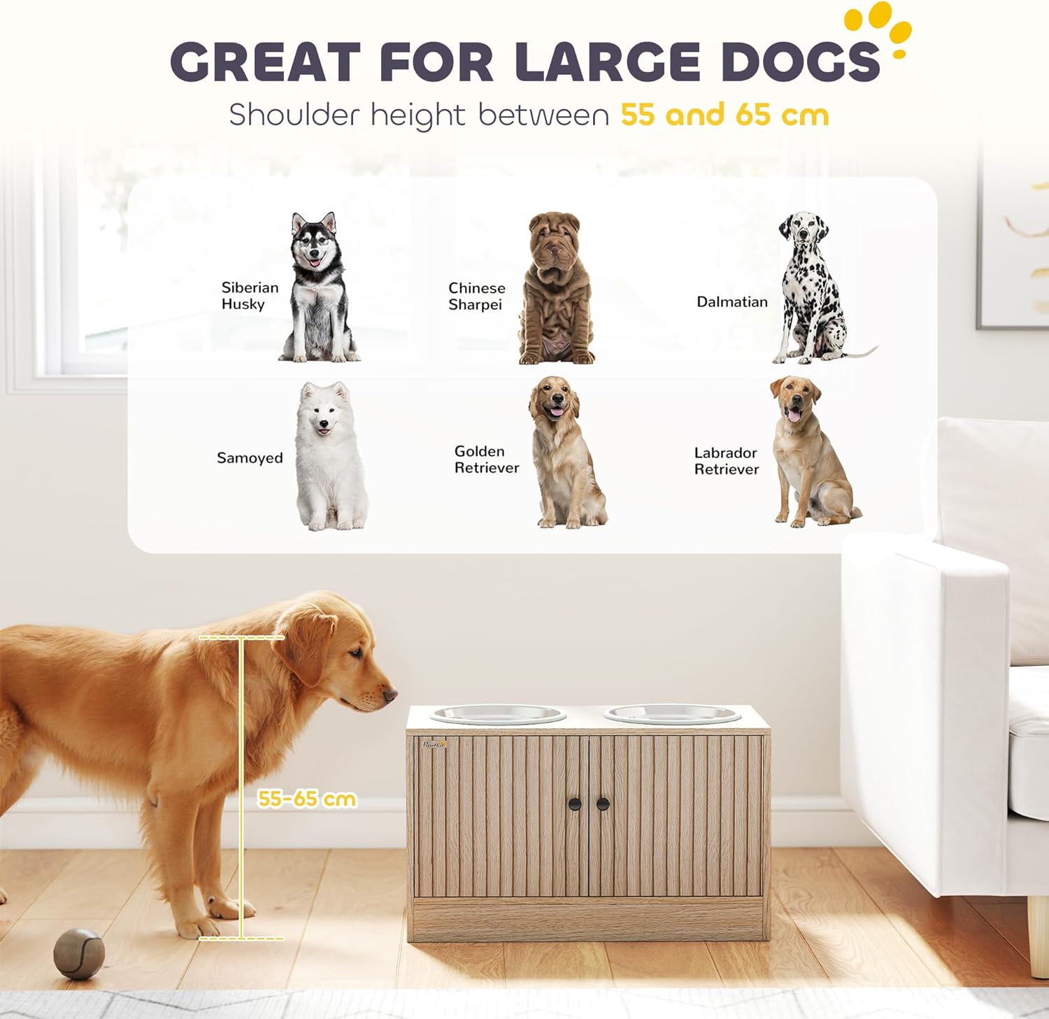 Description:The PawHut dog feeding station elevates food and water bowls to 14" to help improve your large dog's posture during mealtime. This intuitive design helps free your pet from potential neck strain while they partake in meals. In addition, a hidden compartment neatly stores supplies, freeing you from the clutter of storing food bags elsewhere. Its stainless steel bowls ensure a clean, convenient meal experience for your pooch while providing comfort and order for your living space.Features:● Elevated design reduces neck and joint strain for comfortable eating ● Features a 10.6 gal hidden cabinet to keep your pet supplies organized ● Includes two 0.5-gal stainless steel bowls that are robust and hygienic ● Comes with a slow feeder mat to prevent choking ● Anti-slip rings keep bowls stable and reduce noise during meals ● Robust construction with anti-slip pads protects floors from scratches ● Suitable for large dogs with a shoulder height of 21.7"- 25.6" ● Easy assembly required 1 person, 20 minutesSpecifications:● Color: Oak ● Material: Particle Board, Stainless Steel ● Overall Dimension: 23.6" W x 11.8" D x 14" H ● Bowl Size: 9.3" Dia. x 2.8" H ● Bowl Capacity: 0.5 gal (each) ● Door Size (Each): 11" W x 10.4" H ● Storage Space: 22.4" W x 10.6" D x 10.4" H ● Storage Capacity: 10.6 gal ● Maximum Load: 33 lbs. (Top/Inside) ● Item Label: D08-085V00AKPackage Includes:● 1 x Dog Feeder ● 2 x Bowls ● 1 x Manual